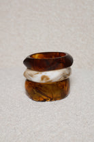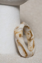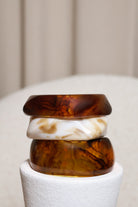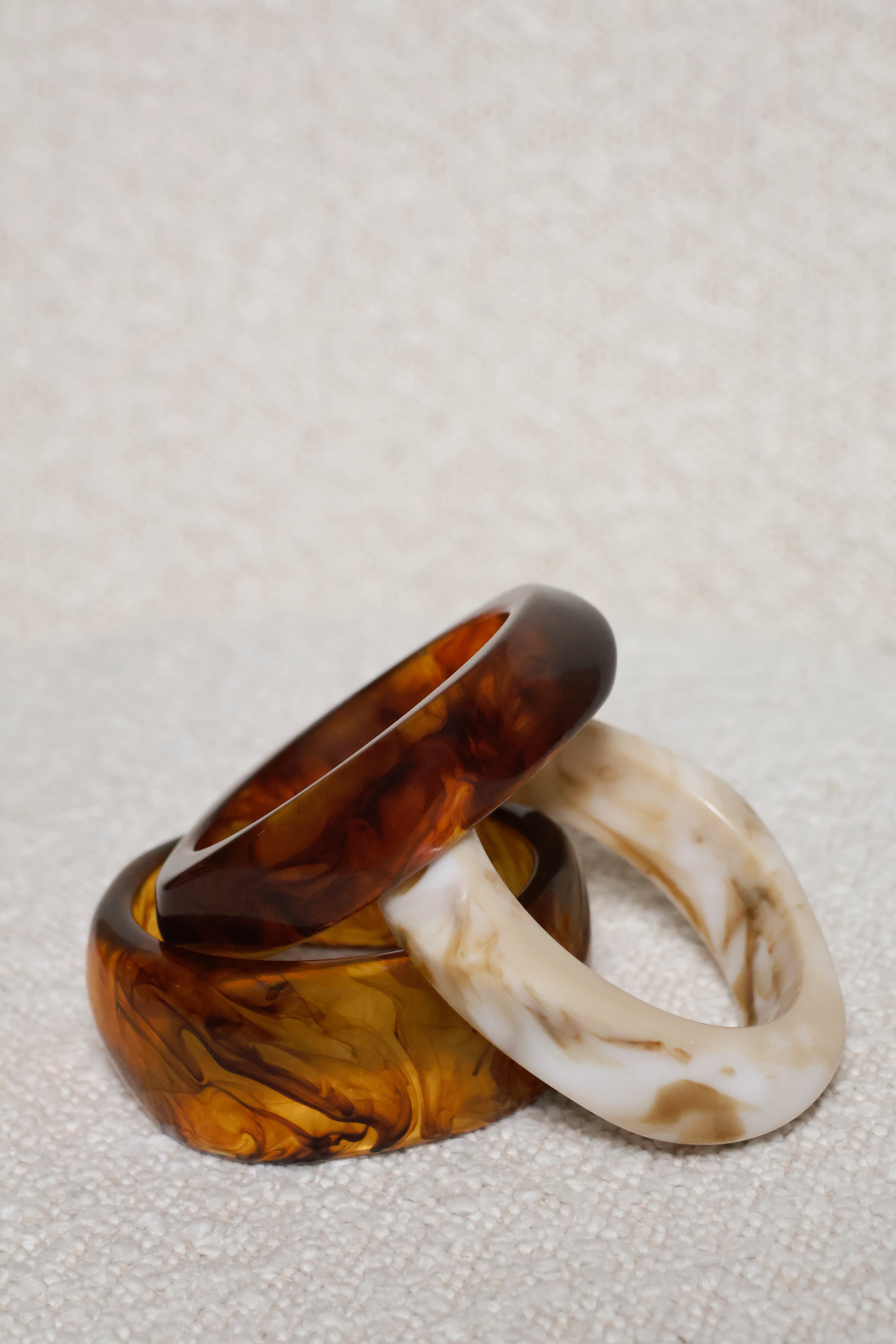 De rijke gemarmerde patronen en zachte vormen geven elke outfit een moderne, organische touch.